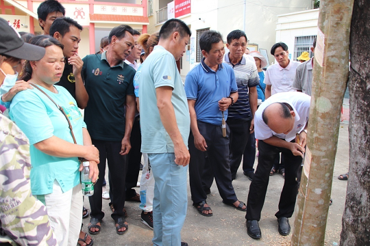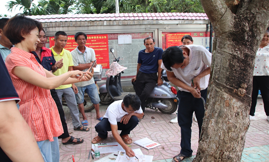 為了檢驗?zāi)z農(nóng)一天來的割膠技術(shù)成績和收獲, 當(dāng)天下午, 還對膠農(nóng)中線、低線和陰線割膠技術(shù)進(jìn)行實操測試。