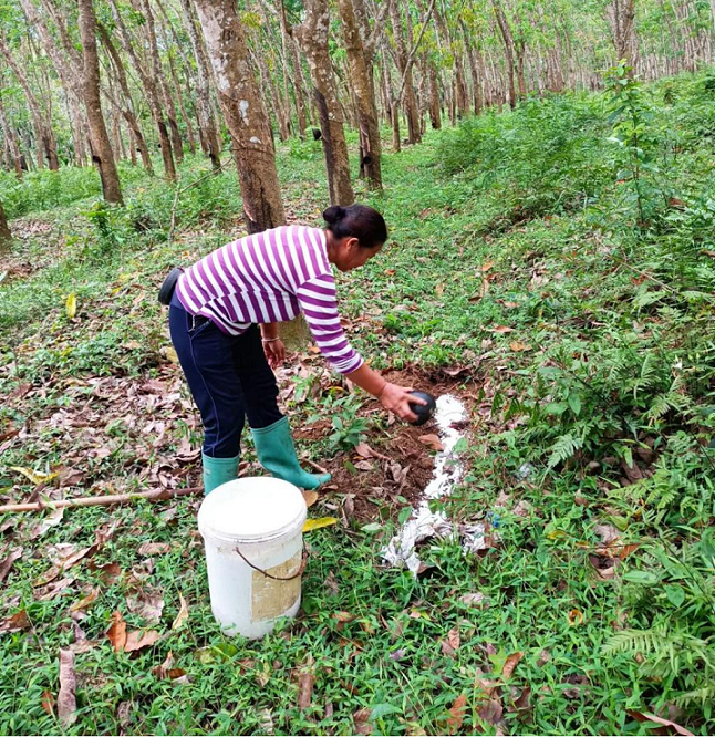 在膠園里,和韋芳想法相同的膠工不少。膠園里熱火朝天,膠工們在做好疫情防控的基礎(chǔ)上,手持膠刀細心割膠,滿頭是汗。林子里切割樹皮的聲音不時沙沙作響。